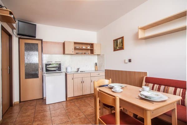Čtyřlůžkový apartmán nabízí dostatek prostoru pro Vaší rodinou dovolenou. Ložnice a obývací prostor s kuchyňským koutem, sprchou, WC nebo společnou ložnicí s druhou TV.
